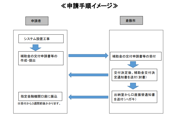 倉敷市創エネ・脱炭素住宅促進補助制度の申請手順は以下のようになっています。