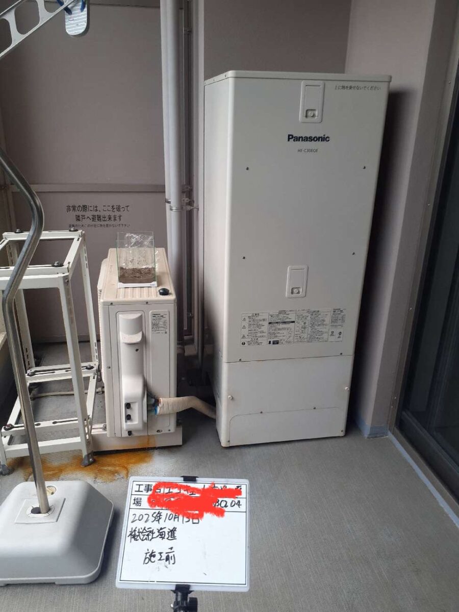 横須賀市のマンション「ザ・パークハウス追浜」にて、Panasonic(パナソニック)製エコキュートHE-C30EQEから最新省エネモデルHE-S37LQSへの交換工事を行いました。既存のエコキュートは10年以上使用されており、お湯の湧き上げに時間がかかる、湯量が安定しないといった不具合が出始めていました。