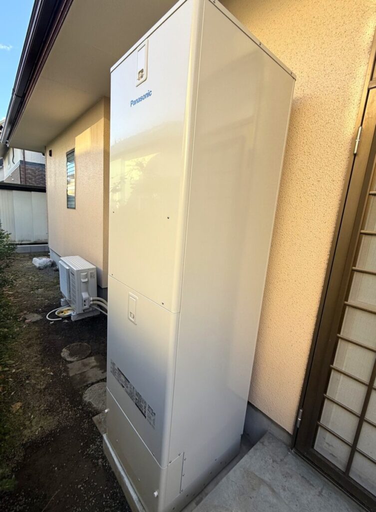 新しく設置したパナソニック製エコキュート「HE-S46LQ」です。460Lの大容量タンクで、ご家族が多くても湯切れの心配なく安心してお使いいただけます。2025年製造の新しいモデルで、省エネ性能が格段に向上。給湯省エネ事業の補助金対象機種です。