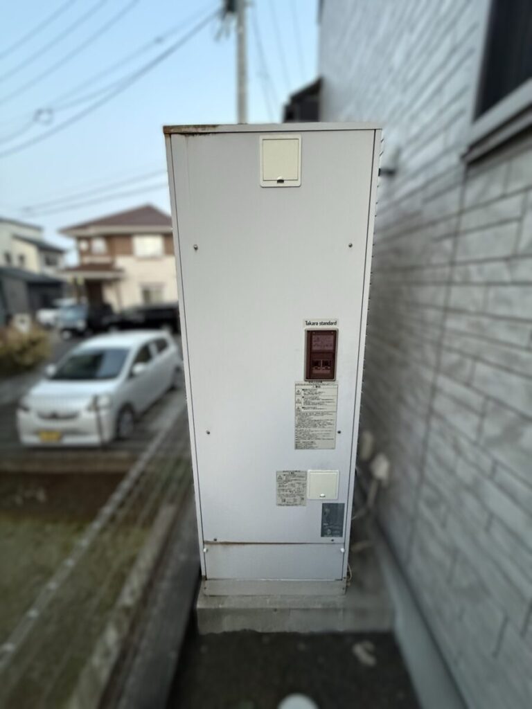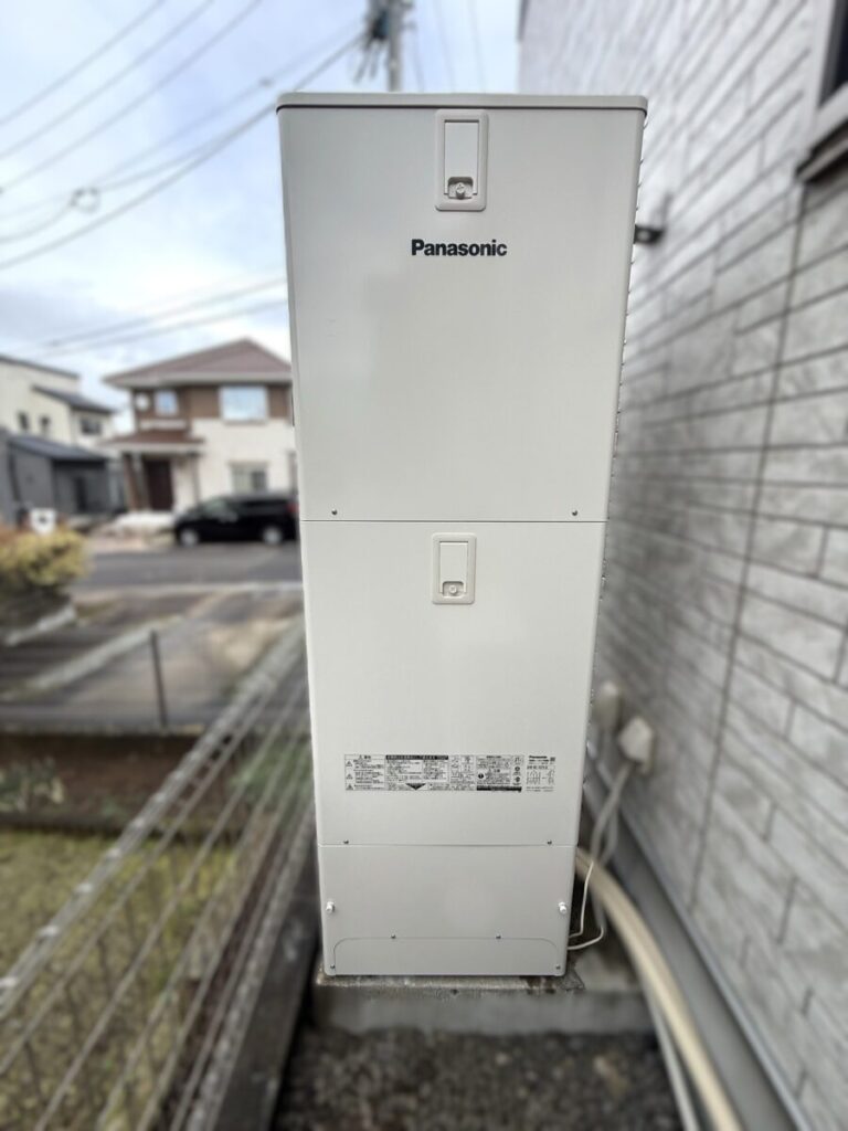 新しく設置したパナソニック製エコキュート「HE-S37LQ」です。以前の電気温水器に比べてスリムなデザインで、外壁周りがすっきりとした印象になりました。